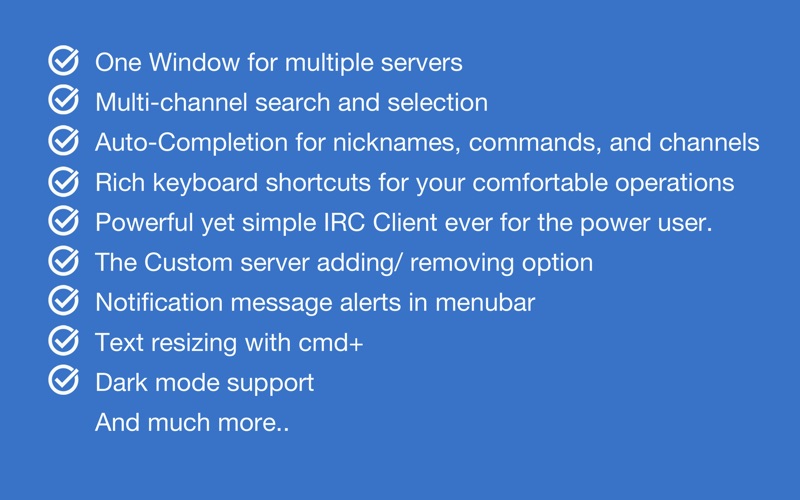 IRC는 전 세계 사람들과 실시간으로 통신 할 수있는 방법을 제공합니다. IRC 서버는 사용자가 IRC에 연결할 수있는 다양한 네트워크 (또는 "넷")로 구성됩니다. ≈ 특징 : ≈ ◉ 여러 대의 서버에 대해 하나의 창 ◉ 현대적이고 아름다운 사용자 인터페이스 ◉ 다 채널 검색 및 선택 ◉ 닉네임, 명령어 및 채널 자동 완료 ◉ 편안한 조작을위한 풍부한 키보드 단축키 ◉ 파워 유저 용으로 강력하면서도 간단한 IRC 클라이언트. ◉ 커스텀 서버 추가 / 제거 옵션 ◉ 다크 / 라이트 모드 지원 ◉ 텍스트의 크기를 조정합니다. 그리고 훨씬 더. 질문이나 제안 사항이 있으시면 [email protected]으로 문의하십시오. Google은 앱을 개선하고 고객이 요청한 유용한 기능을 추가하기 위해 항상 노력하고 있습니다.