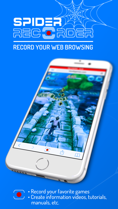 Spider Recorder is a fine handy app in recording videos of websites, web games or browser based apps. The strength of it is that the process of video recording can be accompanied by a voice narration, animated touches and taps and it can even display your emotions (face) using front-facing camera. Application records in two modes, normal mode (with navigation bar and toolbar) or genuine full screen mode. Spider Recorder is the best way to create tutorials, information videos, game recordings and much more! HIGHLIGHTS: - Easy and intuitive. - Quick access to your favorite web pages and frequently visited sites. - Two modes of recording: normal mode and full screen mode (navigation bar and toolbar will be hidden). - Your voice and commentaries are recorded by using a device microphone. - Possibility of adding your face (emotions) to video using front-facing camera. - Displaying the animated taps. - Easy access to the videos using your own video section. WARNING: This app does not record other apps. It is a web recorder intended for recording any website in an in-app web browser. PLEASE NOTE: - You cannot change orientation during recording. - Recorded videos are always stored in your Photos library. - If your device is in silent mode you will not be able to hear a sound in a preview video screen. CUSTOMER SUPPORT Happy customers are our highest priority. If you have a problem with our app, please contact us at [email protected].