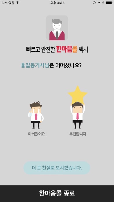 한마음콜 택시 호출 고객용 앱이 출시되었습니다. 친절하고 안전한 대구지역 브랜드콜 한마음콜 택시를 누구나 간편하게 설치하여 이용하실 수 있습니다. [주요기능] 1. Tmap지도 기반 출발지/도착지 설정이 가능합니다. 2. Tmap 교통정보 기반 도착지까지의 택시 예상요금 및 탑승 후 실시간 도착지까지의 예상시간 정보제공. 3. 택시호출 이력관리 - 본인이 호출한 택시의 승/하차시간, 차량정보 등을 확인할 수 있습니다. 4. 안심알리미 기능 - 호출한 택시를 탑승/하차시 시간 및 차량정보를 등록된 가족이나 지인의 핸드폰으로 자동으로 메세지를 전송합니다. 5. 콜택시 평가 기능 - 이용하신 콜택시의 기사님에 대한 친절함을 평가할 수 있습니다.