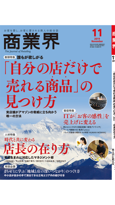 「商業界」は商業の世界に新しい時代をつくりあげ、それによって大衆の豊かな消費生活を実現していこうとする意欲あるすべての流通産業人、商業人のための情報誌です。小売業において大多数を占める中小店を対象にした経営情報を具体的に提案しています。 *出版物のタイトル: 商業界 *発行間隔: 1ヶ月 *定期購読の期間と料金 1ヶ月 1,080円 3ヶ月 3,200円 1年 12,800円 *課金について 定期購読料金はiTunes アカウントにて行われます。 *自動更新時の課金について 自動更新される際の課金については、定期購読期間の終了日の24時間以内に行われます。 *定期購読の確認について 定期購読状況の確認と自動更新の停止は、App Store のApple IDの設定にて行います。 *定期購読のキャンセルについて 定期購読中は、期間の変更やキャンセルをすることができません。 ・利用規約 http://intelade.jp/riyoukiyaku/shogyokai/