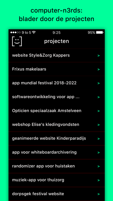 Heb jij een klein programmeer of design klusje? Maar geen idee hoe je een geschikte kandidaat vindt? Op codespot vind jij als ‘Noob’ gemakkelijk en snel de meest geschikte ‘Nerd’ voor jouw klus! Download gratis de app en probeer het zelf! Op codespot vind je in drie eenvoudige stappen de perfecte kandidaat voor je IT klus: 1. Upload je IT klus naar codespot. 2. Laat de Nerds reageren. 3. Vergelijk en kies de juiste Nerd voor jouw klus. Óf ben jij juist erg handig met ontwikkelen van software? Wil je zelf kunnen uitkiezen waar je aan werkt en voor hoeveel? Meld je dan als Nerd aan op codespot en krijg toegang tot de meest uiteenlopende opdrachten van onze Noobs.