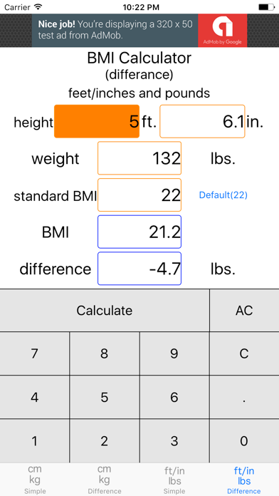 This App is useful BMI(Body Mass Index) Calculator. You can calculate BMI and difference from standard BMI. Standard BMI value is variable. Standard unit and metric unit can be available. Just touch the screen and use. It is suitable for medical professional to use repeatedly.
