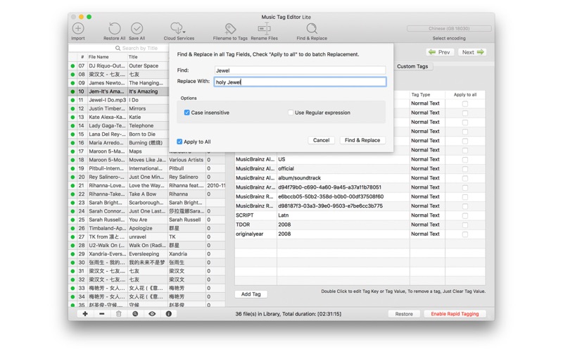 Music Tag Editor can help you to edit your Music Tag info easily and effectively,Batch edit all tags and batch rename with metadata, you can also use it to convert the text encoding of Music Tag, In situations,it can repair the messy code in Music Tags. You also can download the album image for MP3 from internet. Also, you can search tags of music file from Amazon or MusicBrainz cloud services. Support Music formats: MP3, M4A (Apple lossless), MP4, FLAC, APE, AIFF, WAV , Ogg files, asf, dsf, dsd,wma,wmv... Support ID3V1, ID3V2.3,ID3V2.4, xiphComments, APE Tag, Ogg Vorbis, Ogg Speex, Ogg Flac. Main features: 1. support id3v1,id3v2,xiphComments, APE Tag, Ogg Tags, ASF Tags, iTunes tags and so on. 2. support edit any kind of tags of music file. Customize tag's key and value of music file. 3. support batch processing of lots of music files,support iTunes importing. 4. Online album image download,multi album image supported. 5. batch rename audio file with metadata 6. batch convert file name to tags using regular expression 7. user can change,convert the tag text encoding easily, it also can repair messy code in situations. 8. Fully iTunes Tag supported. 9. Support strip APE or ID3V1 tags in mp3 files 10. support to save id3v2.3 or id3v2.4 tags! 11. support Batch Find & Replace tags. 12. Batch clean tags 13. Built-IN Music player for all audio formats 14. export to CSV file in one click. Advance features in pro version: 1.Edit Additional and Advanced Tags. 2.Custom and edit any tags you want. 3.Batch Find & Replace all tag fields in one click. 4.MusicBrainZ Cloud services supported.
