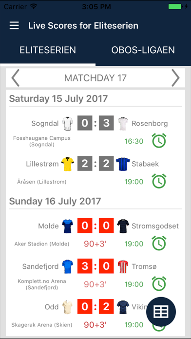 Live Scores for Eliteserien is the app that will allow you to follow the matches of Football Championship in Norway, even you do not have possibility to watch TV or live stream. It includes a schedule of matches, standings and results of Eliteserien, OBOS-ligaen, NM Cup and Super Cup. With the application you will not miss a goal or begin of a match, because it will send you a notifications. You can select favorite matches and receive notifications only for them. In Eliteserien season 2017 play the teams: Rosenborg, Brann, Sarpsborg 08, Odd, Stabaek, Aalesund, Molde, Valerenga, Sandefjord, Stromsgodset, Tromso, Sogndal, Haugesund, Kristiansund, Lillestrom and Viking. Get the fastest results and statistics of football matches in Norway!