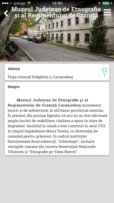 EN & RO EN. Caransebes CityApp is an application aimed at both tourists and locals that is dedicated to the Caransebes city area, in Romania. The app offers detailed information on most attractive POIs and events in the area, as well as on existing local services (hotels, guest houses, restaurants, bars, shops, supermarkets) or local news (city hall press reports). The content is updated real-time and is continuously subject to improving in order to provide accurate and relevant info. The current version of the Caransebes CityApp contains the following themes: - Accommodation: places in Caransebes city that offer accommodation to tourists (hotels, guest houses, campings, etc); - Culture & Leisure: places in and around Caransebes that offer cultural and leisure activities (historical buildings, monuments, parks); - Gastronomy: places in Caransebes that serve food and drinks; - Shopping: the shops that are grouped by type; - Press Report: news that can be found on the City Hall website; - Useful information: official tourist offices, hospitals, pharmacies, police departments, etc; - Public services (cityhall or the education institutions). All POIs contain relevant information (photos, text, address, telephone and cell phone number with the possibility to call using the call function of the device, email address with the possibility to send a message using the email function of the device, website, opening hours, location of the POIs shown on Google maps, routing options) Alphabetical and by distance sorting options are implemented. Also, various filtering options are available, according to the type of POIs. Language switch is available (Romanian, English) directly from the application. RO. Caransebes CityApp este o aplicatie dedicata deopotriva turistilor si localnicilor, administrata de primaria orasului. Aplicatia promoveaza zona orasului Caransebes, Romania. Aplicatia promoveaza informatiile referitoare la cele mai atractive puncte de interes si evenimente din zona, la servicii (hoteluri, pensiuni, restaurante, baruri, magazine) sau stiri locale (comunicate de presa ale primariei). Continutul este in permanenta actualizat de primarie pentru a oferi informatii relevante si de actualitate. Versiunea actuala de Caransebes CityApp contine urmatoarele teme: - Cazare: unitatile de cazare din Caransebes (hoteluri, pensiuni, etc); - Cultura si Timp liber: cladiri istorice, monumente, parcuri; - Obiective turistice: monumente, biserici, rezervatii naturale, parcuri - Gastronomie: locatii in Caransebes unde se poate servi masa; - Cumparaturi: magazinele din oras grupate pe diverse categorii; - Comunicate de Presa: noutati oferite de pagina de web a primariei; - Informatii utile: punctele de informatii turistice, spitaluri, farmacii, sedii politie, service auto; - Servicii Publice (primaria sau institutiile de invatamant din localitate) Toate punctele de interes contin detalii precum: imagini, text, adresa, telefon/telefon mobil cu posibilitatea de apelare directa, adresa de email cu posibilitatea de a trimite mesaj folosind functia email a telefonului, website, orar, locatie pe Google maps si optiuni de navigatie. Toate elementele pot fi sortate alfabetic sau dupa distanta. De asemenea, se pot folosi optiuni de filtrare, in functie de tipul de punct de interes. Aplicatia se poate folosi in 2 limbi (Romana, Engleza) care pot fi schimbate din menu-ul aplicatiei.