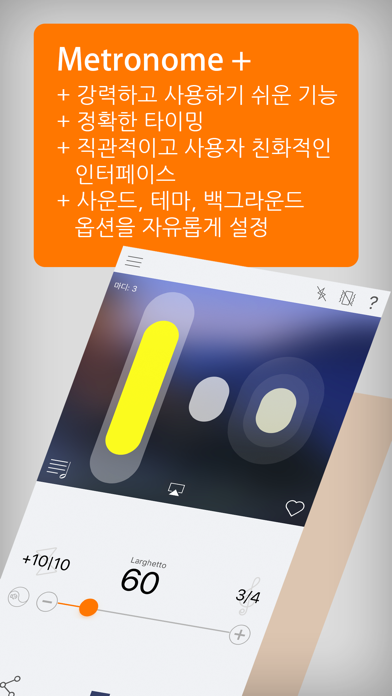 Metronome Plus는 음악가들이 매일의 연습, 세션 녹음 또는 라이브 연주를 향상시킬 수 있는 완벽한 방법입니다. 정확한 실시간 오디오 기술로 수많은 맞춤형 옵션을 지원하므로 다른 메트로놈 앱이 필요하지 않습니다. 다음의 기능을 확인하세요. • 간단하고 사용자 친화적인 인터페이스로 모든 연령대의 음악가에게 적합합니다. • 다양한 모드 - 훈련, 연습, 녹음 등 • 템포, 박자표, 분할, 폴리리듬, 악센트 등으로 리듬을 맞춤 설정합니다. • 세트리스트 관리 - 리듬을 저장하거나 재생 목록 관리자에게 새로운 리듬을 업로드합니다. • 여러 테마와 백그라운드로 나만의 인터페이스를 구축합니다. • 연습을 자신의 취향에 맞추어 설정할 수 있는 16가지의 사운드 옵션을 이용하여 음악을 신나게 연주하세요. • iPhone, iPad 또는 iPod Touch에서 사용 • AirPlay 지원 • 정식 버전으로 업그레이드하여 광고를 제거하고 백그라운드 재생 기능을 활성화하세요!