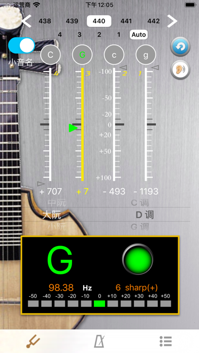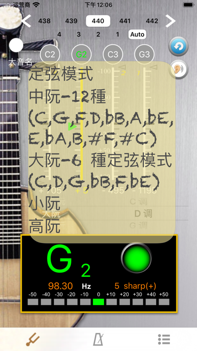 [Ruan Tuner] The simple user interface with noise filtering can help you tuning the 4 strings without any setting while activating the APP. When you pull the Ruan string, the pitch will be shown on the panel for the individual string by indicating signal high or low. [Function Description] ▪ Calibrate Piano Sound : Click on an open string then calibrate the sound with your Ruan. Piano Sound A4=442. ▪ A4 Frequency adjustment: choose 428~452 frequencies for A4 string. ▪ Total 12 kinds of tuning modes are available including : C,G,F,D,bB,A,bE,E,bA,B,#F,#C. ▪ The scale for precision tuning is 10 cents for every sub-bit. The blue line represents the open strings start from. The green arrow means pitch is accurate and it will turn white once the pitch difference exceeds more than a sub-bit. ▪ The complete function, will visually tell you the pitch is good or not by lighting green or white. Users can easily adjust the string by the lighting arrow shown on the scale. We welcome you to feedback us for any questions, suggestions and comments regarding this APP.