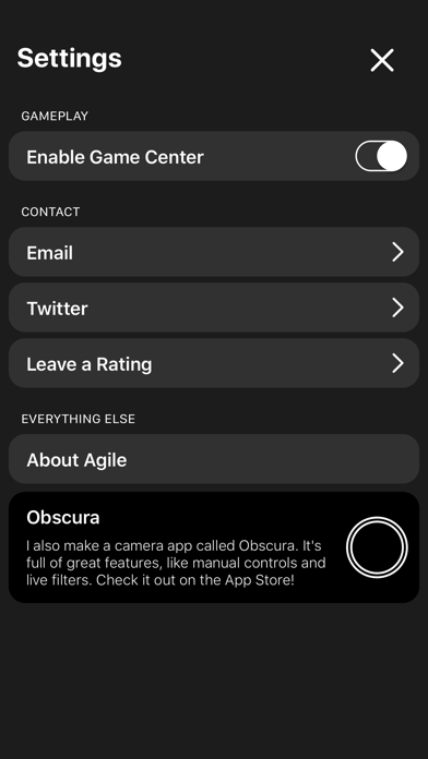 Put your fingers to the test. Agile is a game that will challenge your reflexes, dexterity and ability to tap buttons really quickly! It’s incredibly simple to play, you just tap. And tap. Faster and faster. Easy to start and difficult to stop, until you beat your high score. Agile is neatly integrated with Game Center to provide online leaderboards. And that’s it. There’s no ads, no pop-ups and no distractions. The design is minimal and elegant. It’s all about you and your score.
