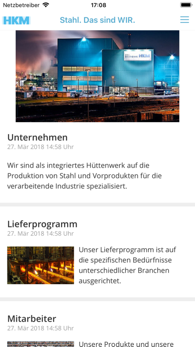 Diese App bietet aktuelle Informationen und Neuigkeiten über die Hüttenwerke Krupp Mannesmann GmbH. Mit Benachrichtigungen sind Sie somit immer und überall auf dem neuesten Stand. Darüber hinaus erhalten Sie folgende Funktionen: Speiseplan, Zufriedenheitsbarometer, Mitarbeiterzeitschriften und Informationsschreiben in digitaler Form, bereichsspezifische Meldungen, IT Meldungen u.v.m.