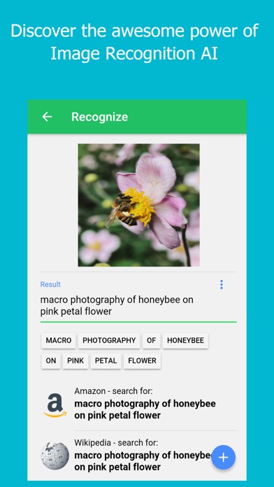 "Image Recognizer" quickly classifies images into thousands of categories (e.g., "sailboat", "lion", "Eiffel Tower"), detects individual objects within images, and finds and reads printed words contained within images. FEATURES * Extract Text: Optical Character Recognition (OCR) enables you to detect text within your images * Logo Detection: Detect popular product logos within an image. * Image Attributes: Detect general attributes of the image, such as dominant colors and appropriate crop hints. * Label Detection: Detect broad sets of categories within an image, ranging from modes of transportation to animals. * And much more… ADDITIONAL FUNCTIONS You can do more with the result after recognizing with the following services: - Amazon - Wikipedia - Youtube - Translation - Image searching - More...