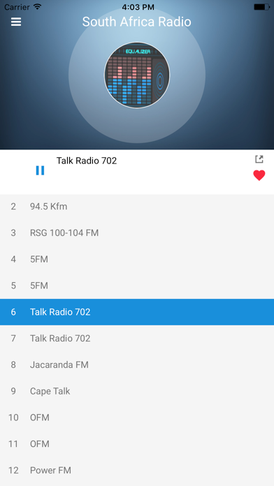 Listen to South Africa FM Radio Player online for free, live at anytime, anywhere! This radio live app covers almost all the popular radio stations where you can simply stream directly without any mess on navigating here and there to find your favorite local radio stations! With this South Africa radio player, you can enjoy: - Play in background, while enjoy doing other stuffs! - Favorite your ZA radio stations for faster and better access next time! - Simple, and uses only little spaces on your iPhone, faster download, easy storage! - Covers almost all the popular ZA radio stations! - Direct streaming source which results in fastest streaming speed with lowest buffering time! - Absolutely Free! Download South African FM radio app now and try it out! You can enjoy listening to all great local music immediately!! List of South Africa Radio Stations FM: - 94.5 Kfm - RSG 100-104 FM - 5FM - Talk Radio 702 - Jacaranda FM - Cape Talk - OFM - Power FM - Groot FM (high) - Groot FM (low) - Algoa FM - 947 - 80s - Luister FM - Impact radio - East Coast Radio (ECR) - CCFM - Bok Radio - 947 - Tygerberg 104FM - Smile 90.4 FM - Hot 91.9 FM - Voice of the Cape - Radio Kansel - Radio 786 - Rainbow FM - Bush Radio - SFM Streek Radio - Fine Music Radio (med) - Fine Music Radio (high) - North West FM - Radio Helderberg (high) - Radio Helderberg (low) - IFM 102.2 - Vhembe FM - Radio Islam - Rainbow Gospel Radio - Radio Veritas - Radio NFM 98.1 - Bojanala FM - Link FM - Kasie FM 97.1 - Heartbeat FM - Radio Laeveld - Mix 93.8 - Channel Islam International - Lekker FM - Megazone Bollywood - Kingfisher FM - Radio World Wide / Radio WêreldWyd - Imbokodo FM - OVERVAAL STEREO - Bay FM - Zibonele FM - TUT FM - Worcester FM - PE FM - Radio West Coast 92.3fm - Springbok Internet Radio - Good News Community Radio - Caledon FM - Sunshine Radio - Vuma FM - Koepel Stereo - Radio Hartklop - OFM Bloemfontein - Eden FM - Emalahleni FM - One FM SA - Radio Khwezi - Radio Disa - Radio Ifm - Voice of Hope FM - Valley FM - Vukani FM - Radio Namakwaland 93.4 FM - Radio Teemaneng Stereo - 103 Hope FM - Alex FM - Radio Overberg - Coastal Radio SA - Joyous Radio - Joyful FM Radio - RADIO GAMKA 87.6 FM - All-Time Radio - Treffers Radio - All Jazz Radio - Inanda FM 884 - Radio Riverside - Madibeng FM - Eldos FM - Vibe 94.7 FM - TouchHD (high) - TouchHD (mid) - TouchHD (low) - Hillbrow Radio - Knysna FM - GoldFM 104.3 Welkom - Chai FM - Makhado FM - Aganang FM - East Rand Stereo - Gateway Radio 89.6 FM - VUT FM 96.9 - Giyani Community Radio - Gates of Destiny Radio - Boervolk Radio - Perron FM - Impala Radio - Rise FM - Cliff Central Radio (med) - Cliff Central Radio (high) - Radio Ligstraal - Radio Sprinkaan - MFM 92.6 - Maruleng FM - SME Fusion Radio - Radio DUT - GOLDEN VINYL RADIO - Arrowline Chinese Radio - PubRock Radio - HOPE FM 106.2 FM - Keith Ngesi Radio - Edenvale Radio - Whale Coast FM - Nkomazi FM - Ekklesia Radio SA - Wild Coast 98.6 FM - AfriStream - Radio Sai Global Harmony - Housefrequency - Africa Business Radio - UCT Radio - Skatkis Stereo - Radio Suid Afrika - Lekoa FM - Hoedspruit FM - Voice of Wits 90.5 - Green Horror FM - Mutha FM - Witzenberg Radio - DeepGroove Radio - Mzansi Gospel Mirror - Deep Side Radio - UNISA Radio - Ubuntu Radio - Radio Moot - Gay SA Radio - P4 - Durban Rock Radio - Radio Vryheid - Dreams Radio SA - Internet Gospel Radio - 70vibe-FM - Radio Free Tankwa - Rocknet Online Rock Radio - Lighthouse Radio - UBIQUITY RADIO - Ratanga Radio (low) - Ratanga Radio (high) - The Grind Radio - Bfm1 - Uitsaaines Live - Sauk Radio - Radio Kuber Kontrei - Moutse Community Radio - African Crest Radio - Beat Bangaz Radio - Sirius FM - InspiredFm.Stream - Zone Radio - YoYoRadio - Sunshine Radio Cape town - I am: Youth Radio - Kwagga Radio - Net Radio SA - 87.6 RIVER FM - ChillOutRadioSA - Life FM - Dexterity Radio - Xruis Radio - CAPS Radio - BizRadio - Spinnerak Radio - Just Playing Haydn - ...