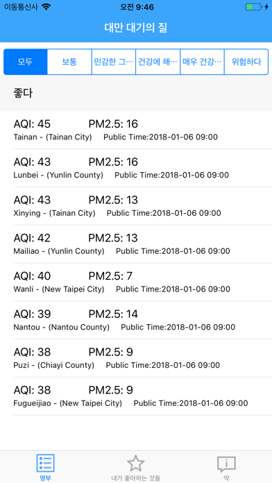 이 응용 프로그램은 환경 보호 행정관 Yuan, R.O.C.의 공개 데이터 플랫폼에 속한 API를 가지고 있습니다. (대만). 우리는이 API를 사용하여 목록에있는 대만의 대기 질 데이터를 제공합니다. 그것은 사용자가 모든 카운티 / 도시의 대기 질을 확인하고 사용자가 좋아하는 장소를 표시 / 삭제하도록 허용합니다. 이 응용 프로그램은 무료입니다.