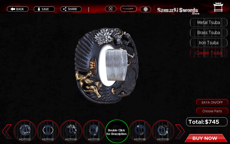 Use our app to create your custom Katana or any other samurai swords, download now and enjoy a 3D experience creating your Katana with full control and huge variety of options, modifications and enhancement for your blade. once ready you can simply purchase it through our system, and our master swordmaker will start working on your blade with high attention to details and customization options you have chosen. Stunning Visuals - Beautiful 3D Graphics based on real, beautiful and detailed models.. - Real time preview of custom swords - Save models and load them anytime you want Full Control - Zoom, spin and rotate models - Two different backgrounds while designing your Samurai sword - Fun and easy Discounts and Special Offers - Join the VIP club within the app to receive monthly coupons - Hidden discounts for set items - Join our affiliate program and enjoy the benefits Those are the main key features you can select from when building your Katana: Choose Your Steel We offer a large variety of steel types, all of our swords are full tang and can be either ordered non-sharp, sharp or razor sharp, you can choose the steel types from various carbon contents, such as 1060 carbon steel, 1095 carbon steel, 9260 Spring steel and T10 tool steel. Your blade can be folded to create thousands of layers and a grain pattern on the steel, it can also be clay tempered (differentially hardened) to achieve an authentic hamon line of your choice. Fitting Beside the blade, you can choose from hundreds of fittings, which includes beautiful designs of Tsuba (Handguard), Habaki, Seppa, Fuchi, Kashira and Menuki. Featuring animal designs, warriors, nature, mythological creatures and a lot more, all hand crafted from your choice of quality materials. Handle The Tsuka Ito is the handle wrap of the Samurai sword, a wood handle covering the Nakago with rayskin samegawa and ito wrap of different colors and materials of your choice, either in traditional style wrap or battle style wrap. Scabbard The Saya is an important part of all Samurai swords, it is the scabbard that is used both to secure the blade and allow fast drawing of the sword by a skilled swordsman, Our collection has variety of materials and colors for your Saya, all are hand crafted and perfectly made to fit with your blade. Enhancements To make your sword truly unique, you can choose to enhance it, by selecting some of our unique features like blade with engraved text or image, different polishing styles and even colored blades that has been naturally dyed with acid. Accessories Aside from the blade you can also choose from our selection of accessories which includes bags, stands and boxes to display your sword with or carry it around. Coming Up in the Next Update: Currently, you can only build a Katana, however there is a lot to wait for when it comes to the next update of the app which you will be able to create all those sword types: Wakizashi - The auxiliary sword of the Samurai Tanto - Short blade for one hand wielding. Nodachi - The great battle field sword Nagamaki - Similar to Katana but feature longer handle and more curve Ninjato - Straight blade Ninja swords Shirasaya - Plain steel with Natural wood handle and scabbard (Similar to Zatoichi sword)