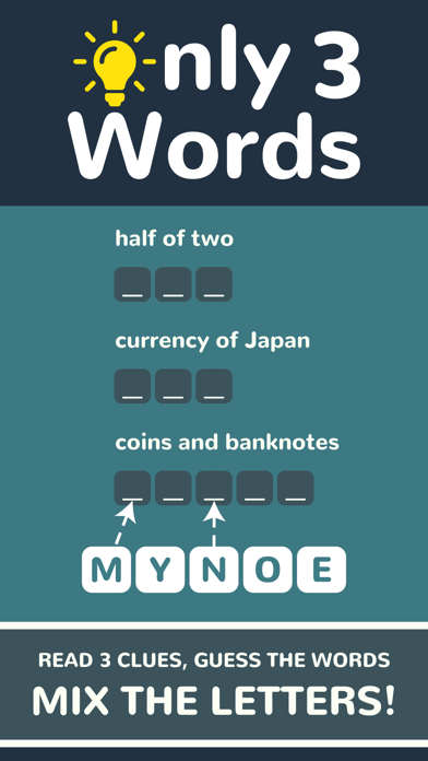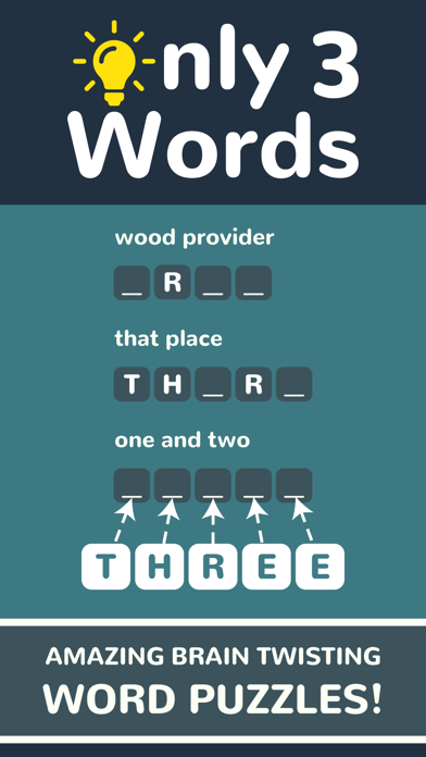 Free Fun Game! Addicting thinking word game! Guess the words. Mix the letters. 3 Words are all you need! Tons of word puzzles to boost up your brain power! Some easy, some challenging, and some tricky! ●PURE AND INSTANT FUN● No registration, no complicated rules. Just start playing, guess the words, and have fun! ●SIMPLE AND HIGHLY ADDICTIVE GAMEPLAY● Read the clues and think; find out what words are the answers. Guess the word. Mix the letters. Win! ●NO WIFI WORD GAME - OFFLINE● You can play Only 3 Words game offline anywhere anytime. No Internet is required! ●FAMILY FRIENDLY● Only 3 Words is one of the best word games for kids. Help your kids to guess the words from the hints and mix the letters. Have a great time together with these amazing word puzzles from Only 3 Words! If you are a word game lover, you will find this game to be quick, easy, and a lot of fun! See if you can handle the addictive word challenge Only 3 Words!