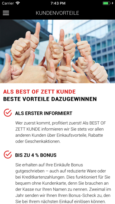 Mit der Best of ZETT App haben Sie alle Vorteile von ZETT Mode auf Ihrem Smartphone immer dabei – und einige Mehrwerte zusätzlich. Meine Kundenkarte anzeigen: Mit dieser Funktion sammeln Sie bei uns Ihren Umsatz-Bonus für den nächsten Bonus-Scheck. Ihre Karte wird überflüssig. Ihre exklusiven Vorteile bekommen Sie direkt auf Ihr Smartphone gepusht. Damit können Sie direkt und sofort von Ihren Bonus-Schecks, Vorteilsgutscheinen wie €-Coupons, Give-aways und Rabatten profitieren und direkt mit der App bei uns einlösen. Meine Einladungen: Auch Ihre Einladungen zu unseren Events und Vorteils-Aktionen bekommen Sie direkt auf Ihr Smartphone gepusht. Auf Wunsch können Sie sich hier direkt anmelden. Personal-Shopping: Hier können Sie für Ihren Wunschtermin einen persönlichen Berater wählen. News: Mit unserem News-Blog bleiben Sie immer up to date in Sachen Fashion, Funktion und Innovation.