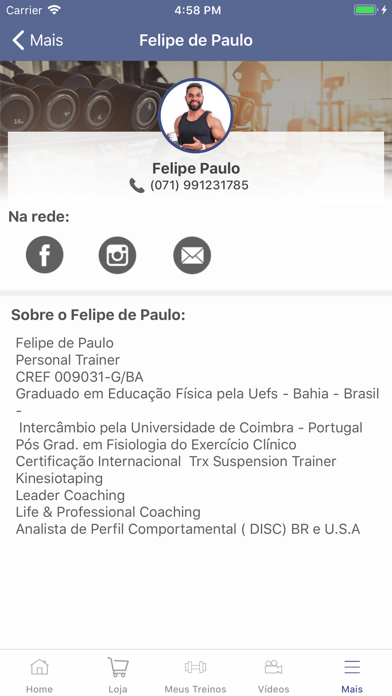 O aplicativo Felipe De Paulo foi criado especialmente para o acesso de alunos e clientes as consultoria de treinos do personal Felipe de Paulo. Através do aplicativo também é possível comprar produtos de consultoria de treinos. A prescrição de treinos do personal Felipe de Paulo é realizada em dois princípios básicos que são: Especificidade e Individualidade Biológica, e utiliza o que a ciência tem de mais atual em métodos de treinos, como metodologias russas e alemãs, para que de forma eficiente, atinja seus desejos e objetivos. Através do aplicativo o personal Felipe de Paulo incentiva, motiva, e acompanha os alunos, para alcançarem seus desejos e objetivos. O que você vai encontrar neste aplicativo : - Seus treinos criados individualmente com base em seus objetivos - Imagens e vídeos dos exercícios ( o que facilita na execução, segurança e correção do movimento) - Chat online para falar com o Felipe de Paulo - Blog e canal de vídeos com dicas especiais.