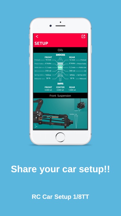 RC Car Setup 1/8 TT now for mobiles! with this app you can save the setup you use in each track, and share it!. The data you can save is divided into four sections: Race Info, Oils, Front Suspension and Rear Suspension. Race Info data: - Event - Driver - Car - Radio - Servos - Engine - Fuel - Glow plug - Clutch - Gearing - Tyres - Best time - Photo - Notes Oils data: - Preload (front and rear shocks) - Spring color (front and rear shocks) - Oil (front and rear shocks) - Piston holes (front and rear shocks) - Hole size (front and rear shocks) - Rebound (front and rear shocks) - Oil (front, center and rear diff) Suspension data: - Shock position (front and rear suspension) - Upper link position (front and rear suspension) - Lower arm position (front and rear suspension) - Ackerman (front suspension) - Upper link spacers (front suspension) - Ride height (front and rear suspension) - Camber (front and rear suspension) - Caster (front and rear suspension) - Toe (front and rear suspension) - Sway bar (front and rear suspension) - Wheel hex (front and rear suspension) - Balanced weight (front and rear suspension) - Wing (rear suspension) Make and models available: - Agama -> 215SV / 215 / A8EVO / A215E / A215T / A8T-Evo - Associated -> RC8B3.1 / RC8B3 / RC8B3.1E / RC8T3.1 / RC8T3.1E - Durango -> DNX8 / DEX8 / DEX8T - HB Racing -> D819 / D817V2 / D817 / E817V2 / D817T / E817T - Hobao -> Hyper VS / Hyper 9 / Hyper VSE / Hyper SSe / Hyper ST Pro - Hong Nor -> X3 Sabre Evo3.0 / X3 Sabre / X3 Sabre E - JQ -> The Car 2017 / The Car 2015/16 / Grey Edition - Kyosho -> MP10 / MP9 TKI4 / MP9 TKI3 / MP9 / MP9E TKI4 / ST-RR Evo2 - Mugen Seiki -> MBX8, MBX7 / MBX8Eco / MBX-7TR / MBX-7TRE - Serpent -> Cobra SRX8 Evo / Cobra 2.2 / Cobra SRX8E / Cobra E-Truggy - Sworkz -> S35-3 / S350 EvoII / Apollo / S35-3E, S35-T / Zeus / S35-TE - Tekno -> NB-48.4 / NB-48.3 / EB48.4 / NT-48.3 / ET48.3 - TLR -> 8ight-X / 8ight 4.0 / 8ight 3.0 / 8ight-E4.0 / 8ight-T4.0 / 8ight-TE3.0 - Xray -> XB8´19 / XB8´18 / XB8´17 / XB8E´19 / XB8E´18 / XT9 / XT8 / XT8E