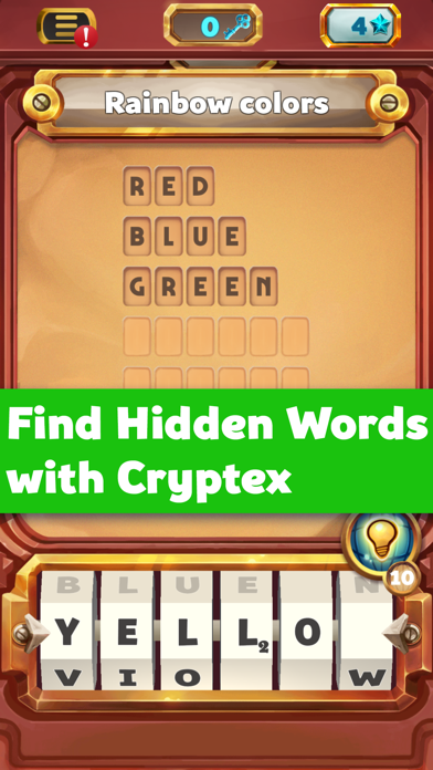 Find hidden words using letters on Cryptex! Let's start exciting words puzzle game! HOW TO PLAY • Simply swipe your finger over cryptex to suggest a word for given topic. • If you've found a valid word it will be marked on the words field. • Find all the words in topic to complete the level. • More words to find - more points. FEATURES • Gameplay based on Cryptex • Free classic mode • Daily bonus rewards • Free hints for each 5 levels • Best exercise for the brain • Game saves • Support both Phones and Tablets • Free update! More levels and game modes coming soon! Stay tuned! N.B. The word cryptex is a neologism coined by the author Dan Brown for his 2003 novel The Da Vinci Code, denoting a portable vault used to hide secret messages. Origin of word: formed from Greek κρυπτός kryptós, “hidden, secret”.