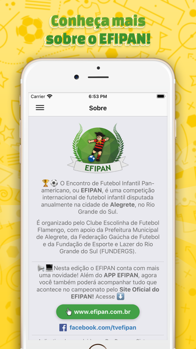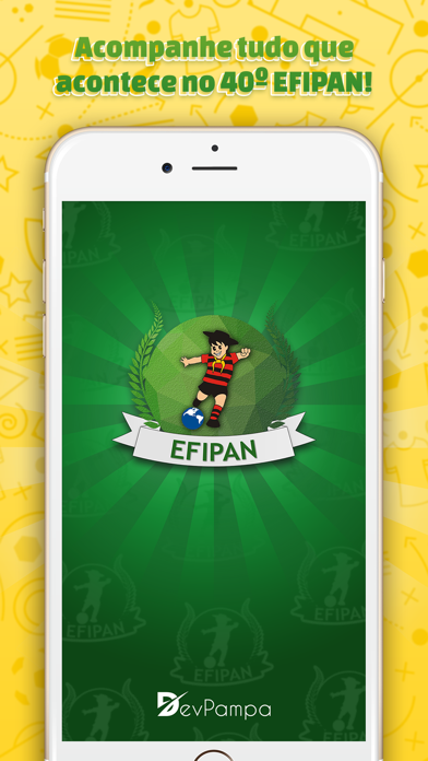 O "Efipan" é o primeiro aplicativo criado exclusivamente para as competições do Efipan. Ele informa aos telespectadores a tabela dos times, os confrontos e resultados das partidas, os atletas e comissão técnica dos times, artilharia, detalhes dos jogos e, tudo isso, instantaneamente. Além disso, oferece uma interface limpa e de fácil utilização trazendo o melhor da usabilidade. Fique inteirado da maior competição sub 13 da região dentro do app Efipan! Agradecemos nossos apoiadores que contribuem para essa inovação. Baixe nosso app e avalie!