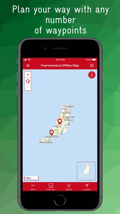 The rotatable map is an extract from OpenstreetMap with additional contour lines (resolution up to 20m). Even small paths and paths are clearly displayed. A variety of Points of Interest (POIs) such as bus stops, doctors, pharmacies, hospitals, police, post offices, banks, ATMs, hiking trails, drinking water points, toilets, petrol stations, ... can be displayed individually. Many POIs have additional information such as opening hours, bus line number, address, disabled access, ... You can search individually for all POIs, as well as for a variety of streets, cities, villages and districts. An overview map shows in a reduced scale in which part of the island the map section is located. A location function shows you your current position. Plan your way with any number of waypoints and share your information with others using the Share function.