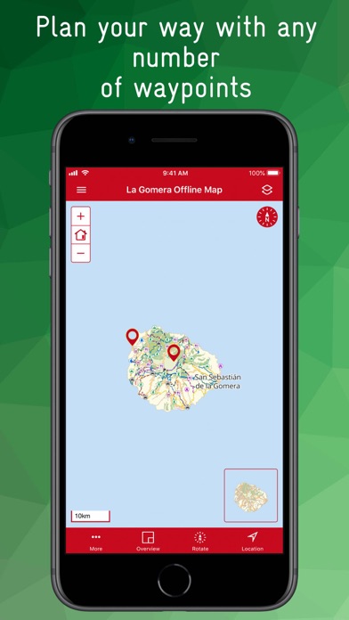 The rotatable map is an extract from OpenstreetMap with additional contour lines (resolution up to 20m). Even small paths and paths are clearly displayed. A variety of Points of Interest (POIs) such as bus stops, doctors, pharmacies, hospitals, police, post offices, banks, ATMs, hiking trails, drinking water points, toilets, petrol stations, ... can be displayed individually. Many POIs have additional information such as opening hours, bus line number, address, disabled access, ... You can search individually for all POIs, as well as for a variety of streets, cities, villages and districts. An overview map shows in a reduced scale in which part of the island the map section is located. A location function shows you your current position. Plan your way with any number of waypoints and share your information with others using the Share function.