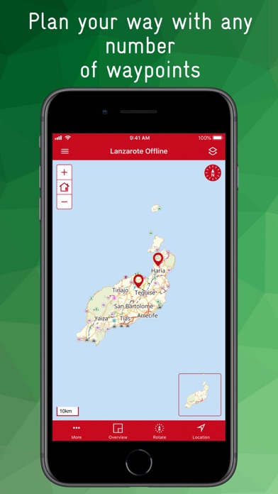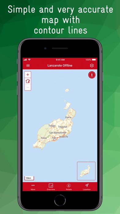 The rotatable map is an extract from OpenstreetMap with additional contour lines (resolution up to 20m). Even small paths and paths are clearly displayed. A variety of Points of Interest (POIs) such as bus stops, doctors, pharmacies, hospitals, police, post offices, banks, ATMs, hiking trails, drinking water points, toilets, petrol stations, ... can be displayed individually. Many POIs have additional information such as opening hours, bus line number, address, disabled access, ... You can search individually for all POIs, as well as for a variety of streets, cities, villages and districts. An overview map shows in a reduced scale in which part of the island the map section is located. A location function shows you your current position. Plan your way with any number of waypoints and share your information with others using the Share function.