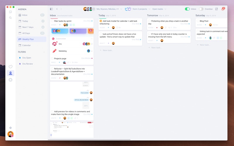 Intuitive project management and visual team collaboration, Ora is your team’s command center. Ora empowers you to work stress-free and collaborate the way you want! Choose an existing methodology or create your own. Ora has everything your team needs to get work done! Task management, Scrum, Kanban, timeline, schedule, issues tracking, time-tracking, checklists, task relationships, automations, integrations, productivity shortcuts, reports on projects & team productivity. Last but not least, according to our users this is THE MOST INTUITIVE and EASY TO USE project management software on the market. (don’t believe me?) Let your grandma setup your first Ora project! Power made simple. Sprints, Epics & Backlog Everything you need to run Scrum Sprints (Sprints Planning, Epics, Story Points, Business Value, Burndown Charts, Team’s Velocity) and more so you can be agile without being a certified PMP or a Scrum master (if you’re one you’d like it even better). Ship early. Ship often. Kanban board Highly visual Kanban board that you can customize the way you want (themes, turn on/off features, list backgrounds, list sizes, dark mode, project backgrounds) so you can make it look (and work) the way you want while implementing the Kanban methodology like a boss. More tasks. Less stress. Timeline & Schedule Plan your product releases, marketing campaigns, and work in general in a modern Gantt (Chart) View and Agenda, where you can see how much work each team member has so you can plan in time and manage your resources successfully. Finish on time now — not next time. Time-Tracking & Reporting Time tracking in Ora is simple. You press the play button on a task when you start working on it (the timer starts) and press the stop button when the task is ready (the timer stops). Then you can see precisely how much each employee is working and on what task. Transparency made simple. List Actions & Automations Automate everything in your project! (the only limit is your creativity) Let Ora do the boring PM work for you so you can focus only on what’s important. With List Actions, you can automate chores like adding labels, assigning tasks, setting due dates, moving tasks, and more! Less chores. More time. Powerful Integrations Ora also comes with powerful integrations like Zapier (connect over 1,500+ apps e.g., Google Drive, Dropbox, Intercom, and so on...), Advanced Git Integration (see commits and their diffs directly in your task), Slack (create tasks and receive Ora updates in #Slack) and more! Leverage others. Leverage power. Optimized for Productivity Ora is the most intuitive project management solution that’ll change the way you see work. Create tasks with tasks with @assignee, [labels], screenshots (paste them directly from your clipboard with just CMD + V), and description in one iteration. Optimize your work with intuitive shortcuts (e.g. play/pause timer with “P”) and do everything the way you expect it to work. Sign up now and stop feeling burned-out! Be free. Start living. Now. FEATURES: Project Management Task Management Scrum Support Time Tracking Project Views - multiple boards in one project Kanban View List view Gantt View Custom streamline processes Multiple Selection Task Relationships Task Types Subtasks Epics Milestones Agenda (My Tasks) - tasks from all your projects in one place Highly customizable - you can turn features on/off to suit your needs Themes Dark mode, Night mode, Reading mode Labels Checklists Comments Markdown @mentions Subtasks Due dates Git Integration - see commits and their diffs in the task description