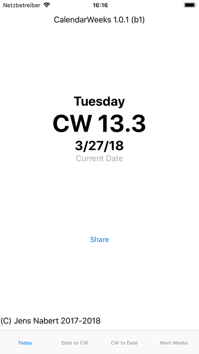 Introduction ========= In the normal, private world we think in days, months and years. In everyday working life, however, planning usually takes place in calendar weeks. Many employees do not even know the current calendar week. At this point CalendarWeeks helps and builds a bridge between the two worlds. CalendarWeeks ========== CalendarWeeks displays the calendar week for the current date. It is also possible to specify the calendar week on any date. Conversely, the corresponding date can also be calculated based on a calendar week. Particularities ========== The CalendarWeeks was developed with SWIFT especially for iOS. As a result, it is optimally integrated into the system, offers an optimal app feeling, best performance, requires minimal storage space and offers system-specific functionalities. Main functionality ============= After starting the application, the question about the current calendar week is answered and the calendar week is displayed for the current date. In order to understand common details of calendar weeks in the project business, the date can be calculated for any specification of a calendar week (with the corresponding year). However, any date can also be converted into a project-understandable specification as calendar week. The range of functions is completed with a display of the next ten calendar weeks with date of beginning which is useful in the project business. The 10-week excerpt can be moved over time, for example, for a retrospective of the past few weeks. Today widget ========== CalendarWeeks has a useful Today widget that (when visible) always shows the calendar week at the current date. Apple Watch app ============ CalendarWeeks can be used with the Apple Watch. Here an app was implemented, which shows the calendar week at the current date. Apple Watch Complication =================== CalendarWeeks can be integrated into many clock faces on the Apple Watch. For this purpose, complications in different sizes are implemented, each showing the calendar week at the current date. Timeshift is supported. Interoperability =========== Sharing with other applications is possible through the sharing feature of iOS. Summary of functions ================ - Show current calendar week - Determine calendar week at a defined date - Determine date for a calendar week - 10 weeks preview - Share - Today widget - Apple Watch app - Apple Watch Complication Differences to CalendarWeeksLite ========================== - Today Widget - Apple Watch app - Apple Watch complication - Support the developer