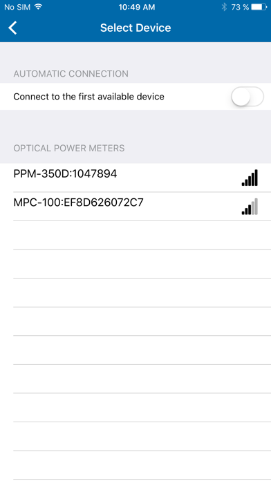The EXFO OPM [Optical Power Meter] application can connect over Bluetooth™ to both EXFO’s PON Power meters (PPM-350D), and power checkers (MPC-100 series). When connected, the app can display live measurements and store measurements, along with the following advanced/additional features: - Manage test configurations (import, delete, sync with instrument) - Select a test configuration to use on the instrument - View test configuration details - Manage measurements (edit name and identification information, export, delete) - Add GPS coordinates to a measurement - View saved measurement details - Generate a PDF test report for a measurement - Share a PDF test report. Specifically for the MPC-100: - Supports Duplex measurements storing values on the transmit (Tx) and Receive (Rx) side on the same window and in the same report. - Export of the results in .JSON format