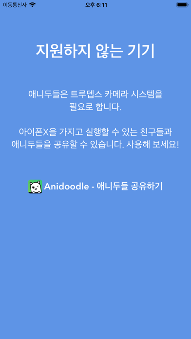당신만의 애니메이션 캐릭터를 그리는 재미가 있어요! 여러가지 다른 얼굴 표정을 그려서 당신만의 애니두들 캐릭터를 만드세요. 그러면, 앱이 트루뎁스 카메라 시스템의 데이터를 사용하여, 귀하의 얼굴 표정을 따라 캐릭터가 따라 움직입니다. 애니두들로 목소리와 함께 저장한 메시지를 친구들과 공유해 보세요! 우선 눈과 입의 표정을 다양하게 그리세요. 그림은 잘 그리지 못해도 놀라운 결과물이 나옵니다! 애니두들로 캐릭터를 만든 후 동영상을 촬영해 보면 캐릭터가 살아 있는 것처럼 귀하의 얼굴 표정을 실시간으로 따라 합니다. 앱은 기기의 트루뎁스 카메라 시스템에서 제공하는 데이터를 해석하여 애니두들의 마법을 보여 줍니다!