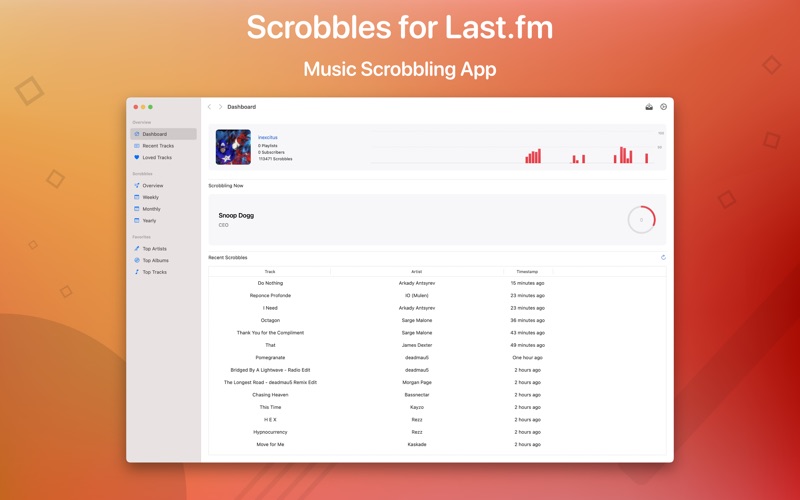 Scrobbles for Last.fm brings the music network Last.fm to your Mac! The app offers both Last.fm statistics and Apple Music scrobbling. Features: • Apple Music Scrobbling Scrobble your currently playing track to Last.fm. Tracks that were played in the past, are not scrobbled. Scrobbles for Last.fm has to be active while the track is playing in Apple Music in order to send the data to Last.fm. • Menu Bar Extras You can show the currently playing track and scrobbling statistics in the configurable menu bar extra! This feature can be disabled in the preferences (when disabled, only an icon is displayed in the menu bar). • macOS Widgets The app comes with four different macOS Widgets. • Mini Player You can use the Mini Player to control the playback of Apple Music. • Favorites Select a time interval and see your favorite albums, artists and tracks! • Data Import Once the app is started, all data since the last app start is imported automatically so the database is always up to date. The data import can also be started manually. • Real-Time Statistics Every single track that is scrobbled is stored in a local database. This database is then used to create a personal listening report. You can see weekly, monthly and yearly listening reports. • Modern Design The app comes in a very lightweight and modern design. This app is powered by AudioScrobbler by Last.fm. If you have any questions or feedback, you can contact the support at any time: Email: [email protected] Contact Form: http://contact.sascha-simon.com