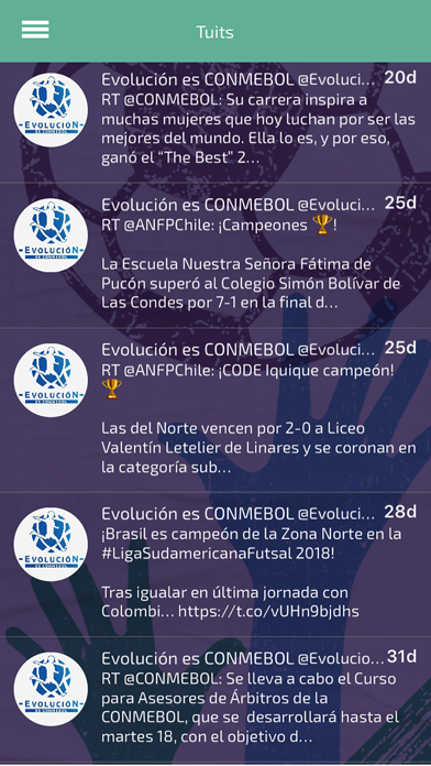 Aplicación móvil del Programa Evolución de la CONMEBOL La Dirección de desarrollo lanzó en el 2017 el Programa Evolución, el cual por primera vez en la historia de la CONMEBOL, ha venido impulsando una estrategia inclusiva que busca potenciar las capacidades de todos los actores del fútbol sudamericano, trabajando en el futuro de las nuevas generaciones, creando oportunidades, superando las barreras culturales para el desarrollo, crecimiento y la consolidación del Fútbol base, el Fútbol femenino, el Futsal y el Fútbol Playa en todas las comunidades de Sudamérica inspirando a #creer en grande.