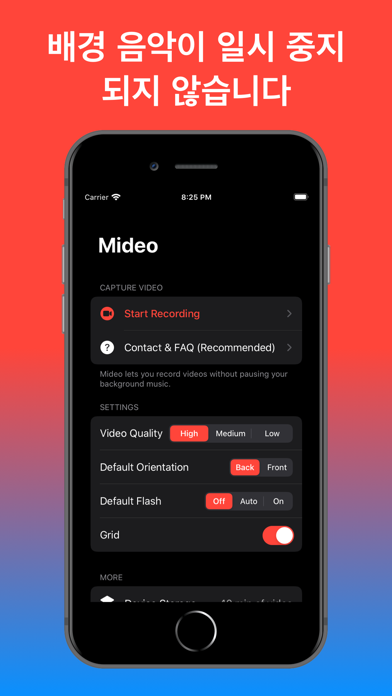 ***App Store 에서 상위 10 개 비디오 앱 중 하나 *** 이미 Mideo를 사용하여 음악과 함께 비디오를 녹화하는 수십만 명의 Mideo 사용자와 함께하십시오! Mideo는 음악을 듣고 비디오를 동시에 녹화하려는 모든 사람에게 꼭 필요한 앱입니다. 작동 방식 : 앱을 통해 음악을 재생 한 다음 Mideo를 열고 녹음을 시작하십시오. 음악이 재생되는 동안 음악이 일시 정지되지 않고 비디오를 녹화 할 수 있습니다. iPhone의 제어 센터를 사용하여 녹음하는 동안 재생중인 노래를 쉽게 변경할 수 있습니다. 전체 연습을 위해 mideo.app/support에서 자주 묻는 질문을 확인하십시오! Mideo는 Apple의 내장 고품질 비디오 카메라를 사용하여 촬영 한 비디오를 카메라 롤에 바로 저장합니다. 추가 기능: • 내장 카메라와 마찬가지로 전면, 후면, 인물, 풍경, 플래시, 줌 및 그리드 라인 지원 • 성능 또는 스토리지 최적화를 위해 고품질, 중간 품질 또는 저품질로 기록 할 수 있습니다. • 당신은 응용 프로그램 내에서 즉시 비디오를 편집 및 다듬을 수 있습니다 • 블루투스, 헤드폰, 내장 스피커 및 기타 오디오 스트림 지원 • Spotify, Apple Music, SoundCloud, YouTube 및 기타 오디오 소스 지원 • 남은 장치 저장 공간 표시 • 앱에서 카메라 롤에 쉽게 액세스 할 수 있습니다 • 그리고 더! 아직 Mideo가 사용 사례에 맞는지 확실하지 않습니까? [email protected]으로 이메일을 보내 주시면 올바른 방향으로 안내해 드리겠습니다. 또한 포괄적 인 자주 묻는 질문 웹 사이트에 대해서는 mideo.app/support를 확인하십시오. Mideo가 없으면 내장 비디오 카메라를 열 때마다 음악이 중지됩니다. Mideo를 사용하면 중단없이 모든 오디오 소스에서 비디오 뮤즈를 할 수 있기 때문에 Mideo는 비디오 녹화 앱의 미디어 괴물입니다. 참고-Mideo와 함께 백그라운드에서 YouTube 음악을 재생하려면 서비스 비용을 YouTube에 지불해야합니다. YouTube와 관련이 없습니다