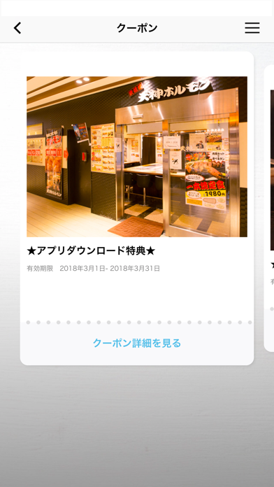 _/_/_/_/_/_/_/_/_/_/_/_/_/_/_/_/_/_/_/_/_/_/_/_/_/_/ 最高のお肉・ホルモン・国産野菜の鉄板焼きを提供する 【鉄板焼 天神ホルモン】の公式店舗アプリです! _/_/_/_/_/_/_/_/_/_/_/_/_/_/_/_/_/_/_/_/_/_/_/_/_/_/ ▶特徴 会員のみなさまに合わせた情報をプッシュ通知にて配信します。 お得な情報など、お手元で簡単に知ることができます。 ▶サービス機能 ・アプリ限定のお得なクーポンが使えます。 ・ご来店に応じてスタンプが貯まります。 ・最新のお知らせ、お得なお知らせを配信します。 −−−−−−−−−−− ご紹介 −−−−−−−−−−− 九州エリアで大人気!新鮮でおいしいホルモン&お肉を 厳選して提供する博多名物【鉄板焼 天神ホルモン】。 新鮮で安全・安心できる料理を提供することも天神ホルモンのこだわり! 食材の回転数が非常に早く、結果、いつも新鮮で鮮度の高い食材を扱う事ができます。 いつも超新鮮で、その新鮮なお肉・ホルモンの味を最大に引き出す、天神ホルモンオリジナルの味噌ダレとの超絶ハーモニー。 ハマること間違いなしです! −−−−−−−−−−−−−−−−−−−−−−−− ご注意 −−−−−−−−−−−−−−−−−−−−−−−− ※アプリ利用は無料です。 ※最新版のアプリをご利用いただくためには、端末のソフトウェアアップデートでOSのバージョンを最新にする必要がございます。 ※一部ご利用頂けないOSがございますのであらかじめご了承ください。推奨バージョンはiOS10以上です。