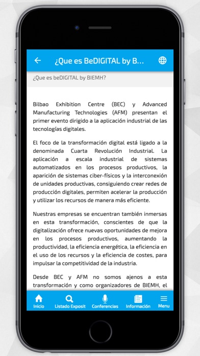Bilbao Exhibition Centre (BEC) y Advanced Manufacturing Technologies (AFM) presentan el primer evento dirigido a la aplicación industrial de las tecnologías digitales. El foco de la transformación digital está ligado a la denominada Cuarta Revolución Industrial. La aplicación a escala industrial de sistemas automatizados en los procesos productivos, la aparición de sistemas ciber-físicos y la interconexión de unidades productivas, consiguiendo crear redes de producción digitales, permiten acelerar la producción y utilizar los recursos de manera más eficiente. Nuestras empresas se encuentran también inmersas en esta transformación, conscientes de que la digitalización ofrece nuevas oportunidades de mejora en los procesos productivos, aumentando la productividad, la eficiencia energética, la eficiencia en el uso de los recursos y la eficiencia de costes, para impulsar la competitividad de la industria. Desde BEC y AFM no somos ajenos a esta transformación y como organizadores de BIEMH, el mayor evento sobre Fabricación Avanzada e Industria 4.0 , queremos poner a disposición de los sectores industriales estratégicos de nuestro país una plataforma adecuada para la transferencia de conocimiento y demostración práctica de lo que ofrece la “Digitalización Industrial”. Por eso hemos creado BeDIGITAL by BIEMH, un punto de encuentro entre los facilitadores de las herramientas de digitalización y las empresas industriales usuarias y potenciales usuarias de estas herramientas. BeDIGITAL ofrece el acercamiento a las tecnologías digitales de las empresas que necesitan conocer las herramientas adecuadas para su perfil, y también contenidos avanzados para aquellas que ya están aplicando la digitalización a sus procesos y plantas productivas. Bajo un formato práctico, presentamos BeDIGITAL en el marco de BIEMH con la certeza de que es el mejor contexto para abordar el reto de la transformación digital y su aplicación a la industria. Desde estas líneas, queremos transmitir nuestra confianza e ilusión en este nuevo reto que nace con el ánimo de ayudar a mejorar la competitividad de las empresas que conforman nuestro entramado industrial. Te invitamos a unirte a este proyecto y trabajar juntos con el objetivo de conseguir los mejores resultados para tu empresa.
