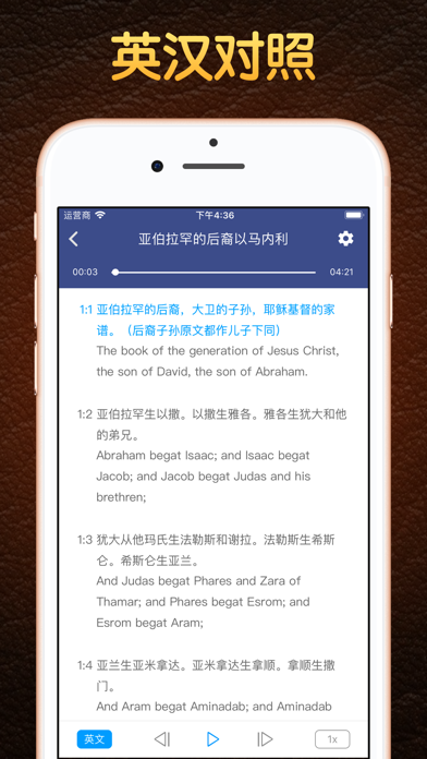 本应用结合圣经读者高效以及简洁的阅读习惯提供了以下全新的阅读特色功能: 1.高清语音播放,声音和文字高度同步,边听边读. 2.全新点读功能,章节定位点读,点到哪里,读到哪里. 3.语速调节功能,不同倍速率调节,选择您喜欢的中肯的听读速度,轻松享受,感化心灵. 4.内容全部涵盖,新约和旧约门类齐全,享受圣经洗礼. 5.圣经搜索功能,使用方便