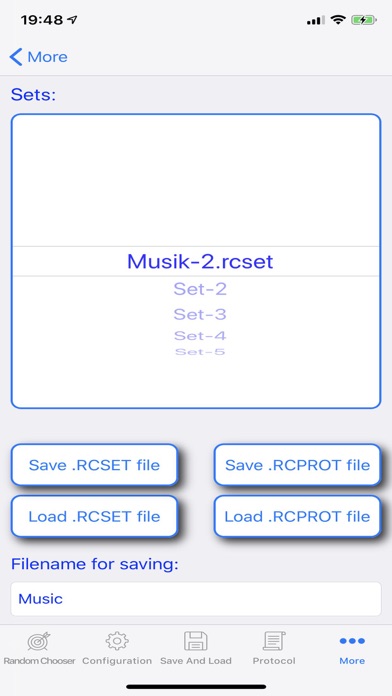 With this app you can configure a set (list) of items (entries) and choose entry by entry by random. What could be the use of this app: You cannot decide, which of your music cds you want to hear. So configure your special music set and let the app decide, which music cd you have to enjoy next. 5 different sets can be handled at the same time. To configure the entries of a set there are three ways: (1) Use the app itself to enter a entry name and add it to one of the 5 sets. (2) Write all entries of a set to a simple ASCII text file (each line contains one entry) and save this file to your Dropbox account with the file extension .rcset. Then export the file with your Dropbox to the RandomChooser App, the file extension .rcset is assigned to that app. (3) Load a file from your device, which you have saved before. Using the app is very simple: (1) Configure your sets of entries on page "Configuration". (2) Choose an entry of one of your sets by random by pressing the big "Choose" button on page "Random Chooser". (3) Save any of your sets to a file and load it to one of our 5 sets again on page "Save And Load". The files are saved in the internal document space of the app.