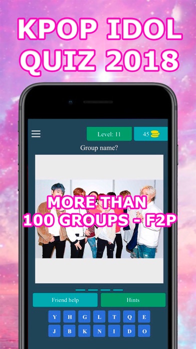 In this game you can guess the names of idol groups Kpop easily or difficult based on level without time limit. Let's show if you're a true Kpop master. Features: - 100% offline app free without internet - Pictures of current Kpop idol - Add knowledge about Kpop idol - Easy to difficult level - Can be shared to social media - Keywords option in each question - Sweet and fun design - Can be played anytime and anywhere Kpop idols of any generations are here: EXID, VIXX, TWICE, NU'EST, T-ara, BTS, and many more. Download Kpop Idol Quiz 2018, share it with your friends and challenge to complete it. If you like Kpop idols and enjoy our games, don't forget to rate this app with 5 stars and leave a comment for the addition of the latest Kpop idol image in the next update. Thank you. Play and enjoy Kpop Idol Quiz 2018!