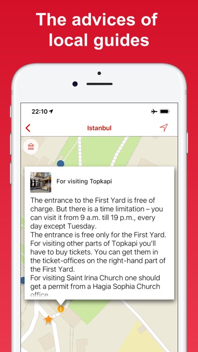 "Istanbul&me. Guide of Turkey" is your personal offline guide to the most popular sights in Istanbul. It's packed with insightful and entertaining information about Istanbul's history, local legends, and the most interesting locations. *You won't need an internet connection to be able to use the excursions and maps. *You're completely free to follow your own route of choice, at any time you like! *With "Istanbul&me. Guide of Turkey" audio-guide you can set off to visit the sights whenever you choose. *You can opt to follow a recommended route – or use the route-builder facility to create your own, that includes exactly those locations you're interested in visiting. When you go sightseeing with the '"Istanbul&me. Guide of Turkey" app, you can combine the must-see sights with the hidden gems many tourists miss – the places known only to locals and true connoisseurs of the city. TOP-VALUE TIP: We have several Istanbul excursions – and you can save nearly 50% if you buy them together in one purchase! And on top of that, you'll receive a promo-code for a further free excursion with our compliments. Expert guide tips – while you are following your preferred excursion route, you'll also get information about local traditions and customs, that's been compiled by expert local guides. Please note: extended use of the GPS navigation function in background mode can significantly decrease battery life.
