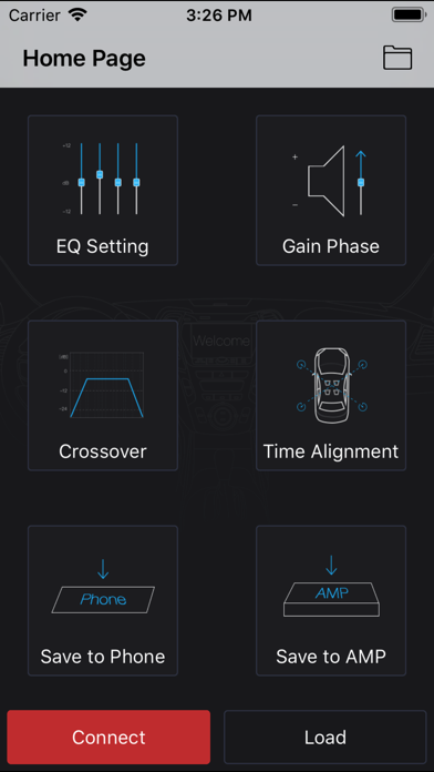 After connecting App to Car Amplifier with Integrated DSP, EQ, BASS, TIME ALIGNMENT, PHASE, MUTE, FILTER , SAVE SOUND SETTING TO PHONE, SAVE SOUND SETTING TO AMPLIFIER, LOAD SOUND SETTING FROM PHONE, RCA OUTPUT etc could be controlled through this App. How to use: 1.Install App and turn on power of car 2. Turn on Bluetooth on your iPhone 3,Open App and wait for around 5 seconds, then click “Connect” icon in left corner of bottom. Amplifier will be connected to App automatically. 4.DIY you preferred sound and then click “Save to AMP” icon to save. Or click “ Save to Phone” to save. Note: 1.Do not exit app during saving and do not turn off power supply, program may be shut down caused by this.