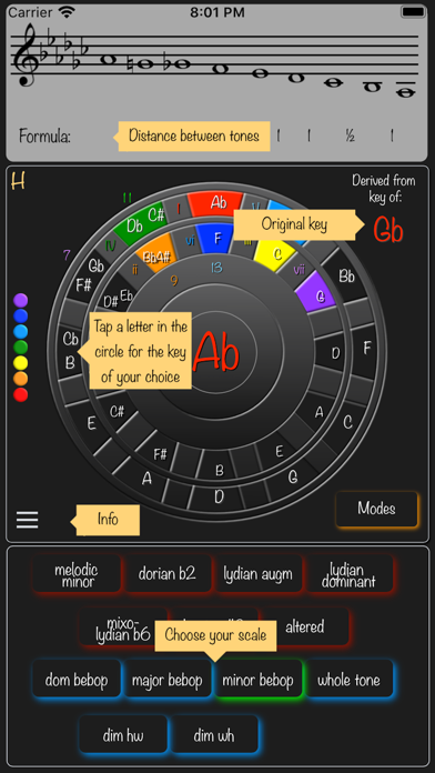-Unique colour coded circle of fifths -Each interval has his own colour -Find the accidentals for the scales in the blink of an eye -Notation -Easily find 27 of the most used scales and modes -Includes 13 most used jazz scales