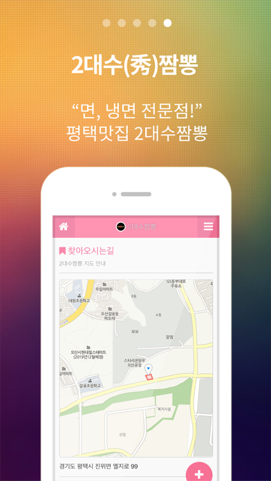 안녕하세요. 2대수짬뽕 앱 방문을 환영합니다. 2대수짬뽕의 창업에 대한 내용 그리고 2대수짬뽕만의 메뉴를 확인할 수 있는 앱입니다. 찾아오시는 길 또는 예약하시려면 문의전화 또는 문의하기 게시판에 글을 남겨주시면 저희가 연락드리겠습니다. 평택시 진위면 엘지로에 위치한 2대수짬뽕은 정통 중화요리 전문점으로 특히 2대째 짬뽕본가로서 엄선된 재료와 저희 만의 비법으로 평택을 대표하는 정통 중화요리 레스토랑입니다. 많은 분들이 찾아주시는 곳으로 알려져 있어 냉면, 면에서 정통 요리까지 취향에 맞춰 맛있게 드시고 있습니다. 앞으로 저희 2대수짬뽕은 한결같은 서비스와 맛으로 고객님을 친 가족같이 모실 것을 약속드립니다. 많은 방문과 사랑부탁드립니다. 감사합니다.