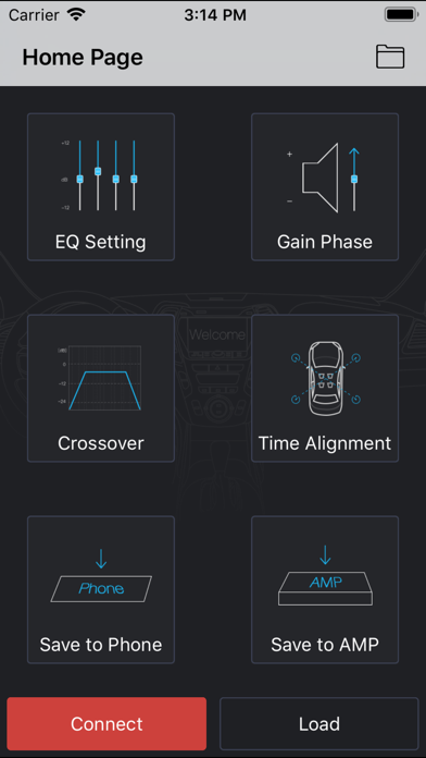 After connecting App to Car Amplifier with Integrated DSP, EQ, BASS, TIME ALIGNMENT, PHASE, MUTE, FILTER , SAVE SOUND SETTING TO PHONE, SAVE SOUND SETTING TO AMPLIFIER, LOAD SOUND SETTING FROM PHONE, RCA OUTPUT etc could be controlled through this App. How to use: 1.Install App and turn on power of car 2. Turn on Bluetooth on your iPhone 3,Open App and wait for around 5 seconds, then click “Connect” icon in left corner of bottom. Amplifier will be connected to App automatically. 4.DIY you preferred sound and then click “Save to AMP” icon to save. Or click “ Save to Phone” to save. Note: 1.Do not exit app during saving and do not turn off power supply, program may be shut down caused by this.