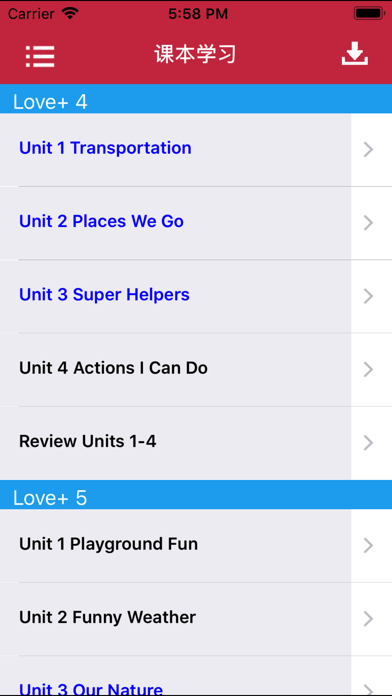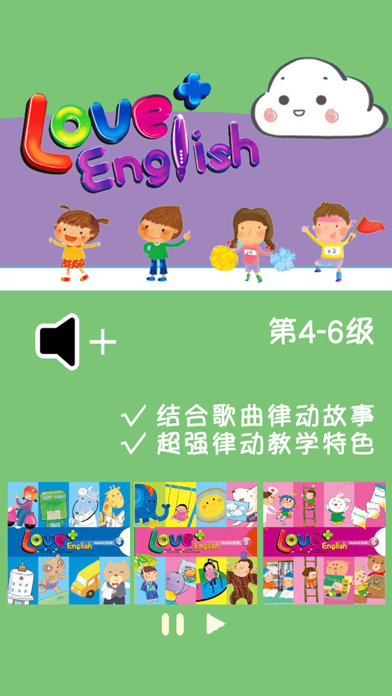 新版的LOVE+ English 爱+英语全面提升学习效果,充满乐趣充满爱的少儿英语系统主教程 - 超强律动教学打造英语学习特色! 结合八大智能主题与螺旋式的课程设计与学习计划,通过单字学习、句型练习、问句对话等环节进入故事展现的阶段,循序渐进,科学合理。 融合画图、音乐的生活英文学习,在故事、歌曲、游戏、律动中展现孩子的英文能力。 丰富新奇的教学内容,充满动感和韵律的教学方法,让您看到充满活力的课堂气氛和孩子的全情投入! 课程特色 * 更丰富的对话和句型 * 取消过难过长的单字 * 增加主题词汇的出现次数 * 多样化的插画风格 * 增添故事环节 LOVE+ English 本套教程为共分6个级别,此应用配套第4-6级(共3级)教程内容。 采用主题式教学;以孩子身心发展规律为依据,科学安排各册主题,循序渐进。 LOVE+ 1,2:主题围绕孩子自身看得见摸得着的日常内容; LOVE+ 3,4:主题围绕孩子生活周边的相关内容; LOVE+ 5,6:扩展到对小区及大自然的认识; 单元架构 LOVE+ English 每个级别4个主题单元,每个单元都有多个环节组成。 * 1. Play & Say:学习背景知识、主题单字、初始句型; * 2. Talk & Act 1:练习运用所习得的背景知识、主题单字与句型于生活情境中; * 3. Sing & Play:藉由歌谣律动认识音节,并带入主题单字欢唱练习; * 4. Chant & Say:复习背景知识、主题单字、套用更多生活句型; * 5. Talk & Act 2:练习运用所习得的背景知识、主题单字与句型于生活情境中; * 6. PLAY & Tell:以耳熟能详的故事复习与练习所习得的所有主题单字、句型与对话; * 7. Review Fun:复习主题内容句型并辨识阅读常见字; * 8. Word Practice:每级最后以所有主题单字图总表做结尾,让孩子复习主题单字; 第一级 32个主题单字;16首单字句型韵谣; 4首主题童谣;8个情境对话故事; 4个童话故事总复习;7个阅读常见字 8个口语句型;8组生活对话 第二级 32个主题单字;16首单字句型韵谣; 4首主题童谣;8个情境对话故事; 4个童话故事总复习;7个阅读常见字 8个口语句型;8组生活对话 第三级 34主题单字;32首单字句型韵谣; 4首主题童谣;8个情境对话故事; 4个童话故事总复习; 10个阅读常见字 16个口语句型;16组生活对话 第四级 34主题单字;32首单字句型韵谣; 4首主题童谣;8个情境对话故事; 4个童话故事总复习; 10个阅读常见字 16个口语句型;16组生活对话 第五级 40主题单字;32首单字句型韵谣; 4首主题童谣;8个情境对话故事; 4个童话故事总复习; 7个阅读常见字 16个口语句型;16组生活对话 第六级 40主题单字;32首单字句型韵谣; 4首主题童谣;8个情境对话故事; 4个童话故事总复习; 7个阅读常见字 16个口语句型;16组生活对话 第4级主课本目录 Unit 1 Transportation Unit 2 Places We Go Unit 3 Super Helpers Unit 4 Actions I Can Do Review Units 1-4 第5级主课本目录 Unit 1 Playground Fun Unit 2 Funny Weather Unit 3 Our Nature Unit 4 Opposite World Review Units 1-4 第6级主课本目录 Unit 1 Fun Games Unit 2 At School Unit 3 Where is It? Unit 4 What Day is Today? Review Units 1-4