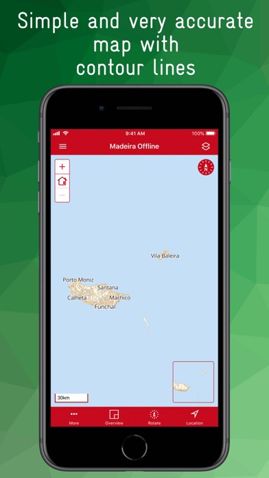 The rotatable map is an extract from OpenstreetMap with additional contour lines (resolution up to 20m). Even small paths and paths are clearly displayed. A variety of Points of Interest (POIs) such as bus stops, doctors, pharmacies, hospitals, police, post offices, banks, ATMs, hiking trails, drinking water points, toilets, petrol stations, ... can be displayed individually. Many POIs have additional information such as opening hours, bus line number, address, disabled access, ... You can search individually for all POIs, as well as for a variety of streets, cities, villages and districts. An overview map shows in a reduced scale in which part of the island the map section is located. A location function shows you your current position. Plan your way with any number of waypoints and share your information with others using the Share function.