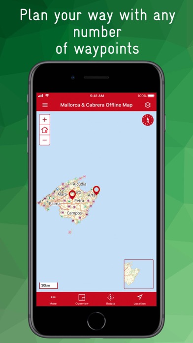 The rotatable map is an extract from OpenstreetMap with additional contour lines (resolution up to 20m). Even small paths and paths are clearly displayed. A variety of Points of Interest (POIs) such as bus stops, doctors, pharmacies, hospitals, police, post offices, banks, ATMs, hiking trails, drinking water points, toilets, petrol stations, ... can be displayed individually. Many POIs have additional information such as opening hours, bus line number, address, disabled access, ... You can search individually for all POIs, as well as for a variety of streets, cities, villages and districts. An overview map shows in a reduced scale in which part of the island the map section is located. A location function shows you your current position. Plan your way with any number of waypoints and share your information with others using the Share function.