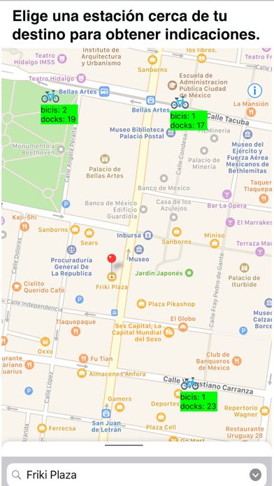 Obtiene la información que necesita para elegir rápidamente una estación para compartir bicicletas para usar. Estaciones de bicicletas incluidas para el área de la Ciudad de México. Caracteristicas: Diseño informativo simple !!! Muestra estaciones de bicicletas cerca de su ubicación o del lugar que seleccione. Cada estación muestra las bicicletas disponibles y los muelles abiertos. Busca indicaciones para cualquier estación que selecciones en el mapa.