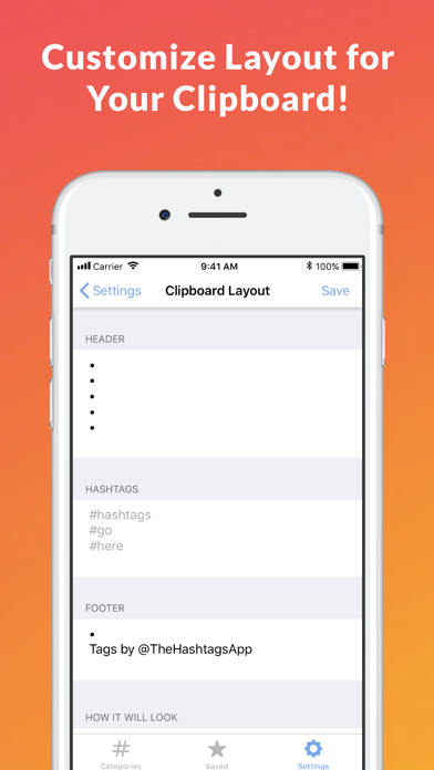 With over 5,000 hashtags to choose from, we provide the easiest way of finding the hottest tags for your Instagram, Facebook and Twitter posts. Stay up to date with the newest trends and grow your Instagram account using our carefully curated hashtags. Through the use of our unique algorithms and deep research, we update our hashtags consistently so you can always find the hottest hashtags to use on your social media posts. Save your favorite hashtags so you don't have to search for them again or create your own hashtag group for a more personalized touch. We aim to facilitate the process of managing your social media hashtags so you can try and reach a broader audience. It's super easy! Just copy the hashtags from our app and paste them to your Instagram, Facebook or Twitter post's description/comment section. Features: - Over 5,000 hashtags to choose from. - Save your favorite hashtags so you can always find them. - Create custom hashtags for a personalized touch. - Edit the clipboard layout to quickly paste the hashtags with a custom format. *The Instagram, Facebook or Twitter App should be installed for the best performance. Disclaimer: We do not guarantee that anyone will achieve the same or similar results as advertised while using our app.