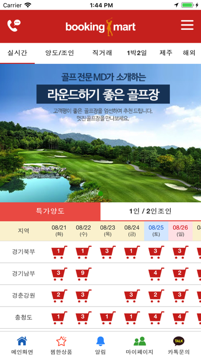 부킹마트 앱 소개 골프부킹서비스 및 국내/해외 골프투어를 제공하는 부킹마트의 어플로 전국 골프장의 실시간 부킹, 베스트상품, 국내 전 지역 골프패키지 운영. 골프에 관한 모든것을 한곳에서 해결할수 있는 One-Stop 골프어플입니다. 주요기능 [실시간예약/양도/조인] - 골프장 실시간 예약가능 - 골프장 그린피 할인 이벤트 및 요금 안내 - 골프장 부킹정보 및 타임 제공 [패키지] - 타사비교 최저가 패키지 구성 - 다양한 투어/테마패키지 및 Early패키지 [골프용품쇼핑 & 직거래정터] - 다양한 골프관련 상품을 합리적 가격에 제공 - 회원간 직거래 오픈장터 제공 [포인트 지급] - 회원가입시 추천인 포함 각 1,000 포인트 지급