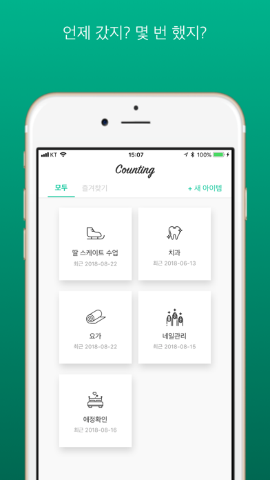 간단한 출석체크 달력 '카운팅' - 언제, 몇번 갔는지 쉽게 확인 - 요가, 수영, 네일, 운동 등 체크 - 우리 아이 발레, 피아노, 스케이트, 독서 등 몇 번 갔는지 체크 - 습관이나 다짐이 몇일동안 지속되고 있는지 기록하기 주요 기능 - 새 아이템 만들기 - 제목과 아이콘 - 달력에서 날짜 체크 표시 - 이번 주, 이번 달, 올해, 누적 횟수 통계 - 최근 6개월 월별 횟수 통계 - 메모